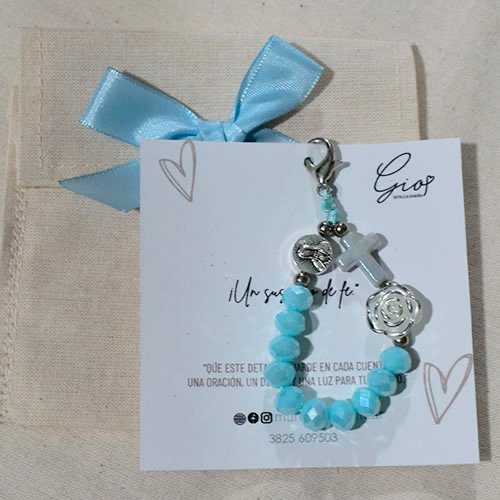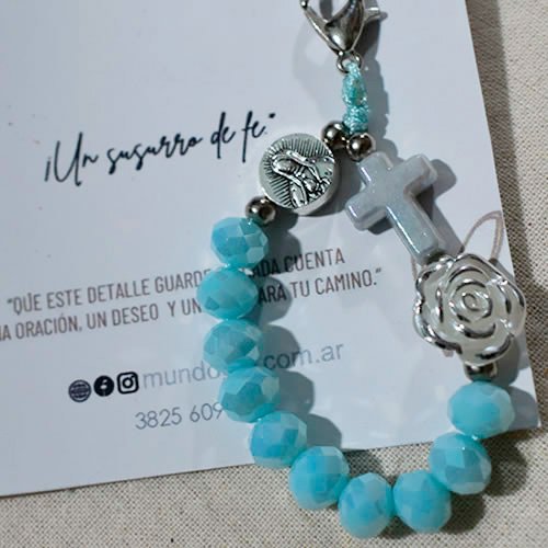 Charm Susurro de Fe celeste elaborado con cristales celestes, flor perlada con bordes plateados, dije Virgen de Guadalupe
