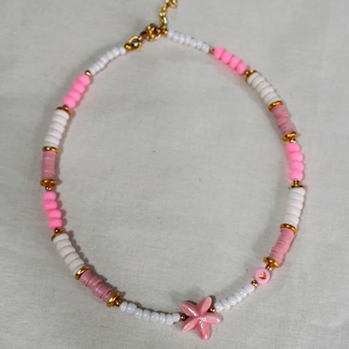 Collar elaborado en fimo rosa viejo y natural, perlas de vidrio facetadas opacas en fucsia, mostacilla natural, pasante corazón, separadores dorados y dije estrella de mar rosa de cerámica