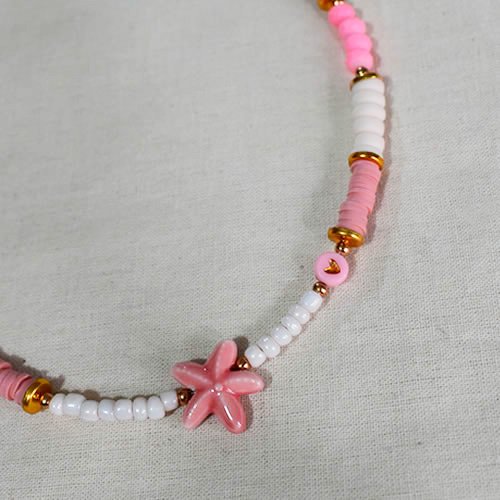 Collar Cielo Rosa, elaborado en fimo rosa viejo y natural, perlas de vidrio facetadas opacas en fucsia, mostacilla natural, pasante corazón, separadores dorados y dije estrella de mar rosa de cerámica