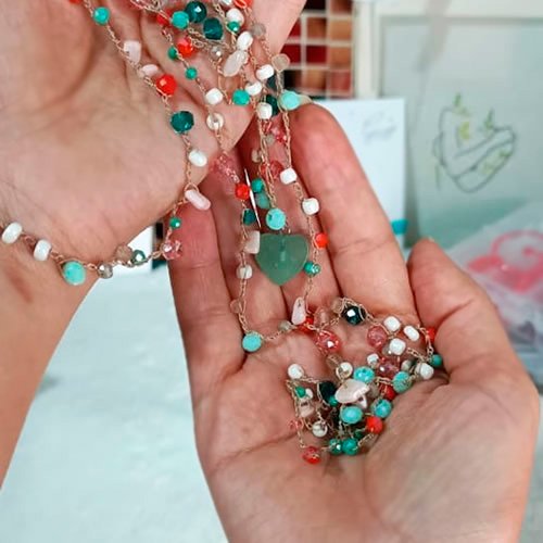 Collar tejido con cristales, escallas, canutillos y dije piedra de JADE 💚en una combinación de tonos divinas. 1.76m aprox