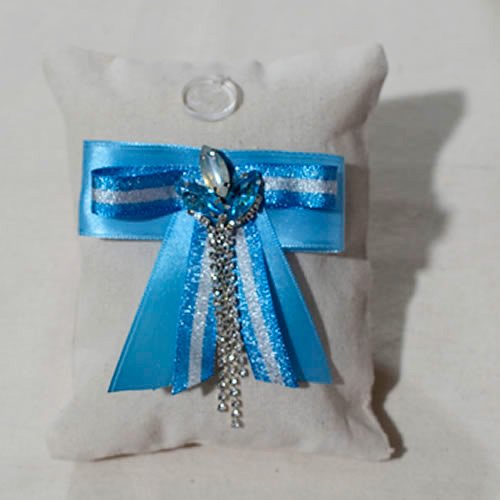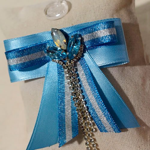 Un diseño que equilibra delicadeza y presencia. Está elaborado en un prendedor base, sus cintas en tonos celeste y blanco se combinan con destellos sutiles